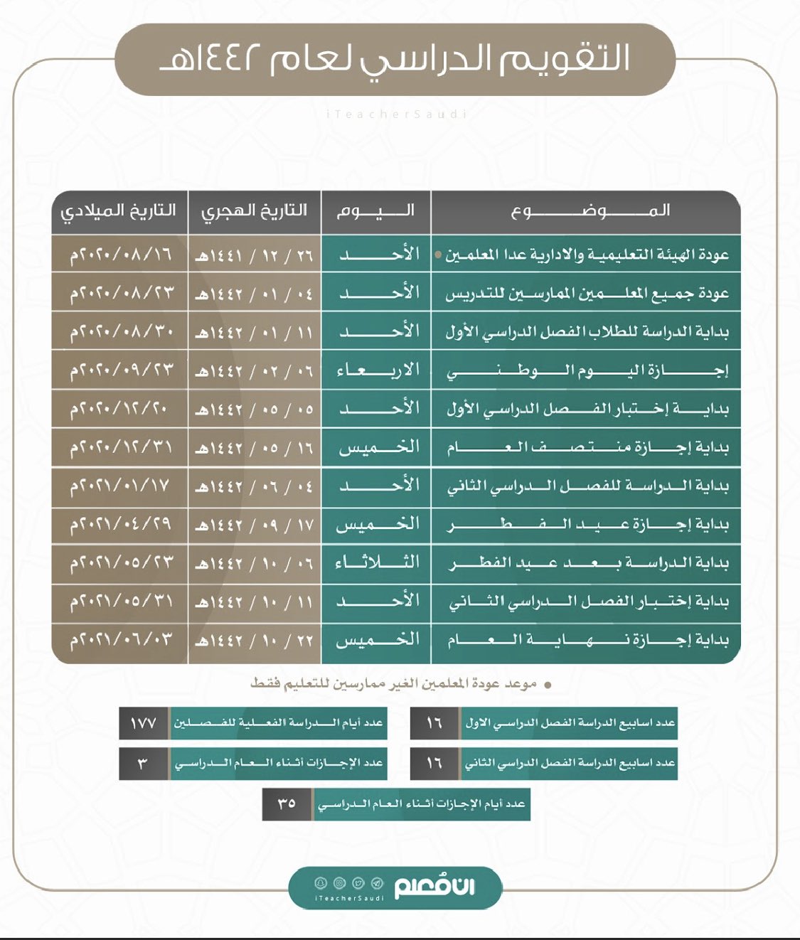 إلى هنا نصل بكم لنهاية مقال التقويم الدراسي 1442 بالاسابيع الفصل الثاني، والذي استعرضنا من خلاله كافة التفاصيل حول موعد بداية الفصل الدراسي الثاني. التقويم الهجري 1442 طباعة، التقويم الهجري ١٤٤٢، التاريخ الهجري 1442، التقويم الهجري الدراسي، روزنامة التقويم الهجري مع الاجازات لعام 1442. يتضمن التقويم الدراسي 1442 بالأسابيع كافة تفاصيل البرنامج الدراسي منذ بدء دوام الطلبة للعام الدراسي 2020 من تاريخ 30 أغسطس حتى نهاية العام الدراسي بـ 3 من شهر يونيو 2021م. الخطة الزمنية الدراسية لجميع الدراسيةالسعودية، المدارس الحكومية، الخاصة، الأهلية، المرحلة الابتدائية والمتوسطة والثانوية. Последние твиты от التقويم الدراسي 1442 (@taqwimksa).
